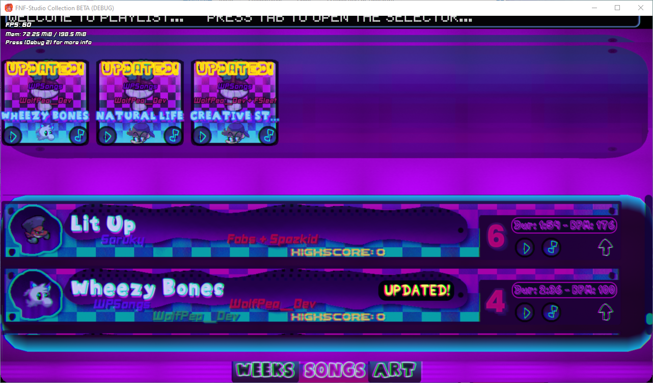 Studio Collection - A Unique Friday Night Funkin' Mod! Studio Collection is a Friday Night Funkin' mod created by WolfPea_Dev, developed in Godot Engine. Since I wasn't familiar with FNF's original programming or its modding engines, I chose Godot because I felt more comfortable with it, even as a beginner in game development! The mod was first conceptualized in 2021, with its initial versions released in 2022. At first, I used random engines because I was always looking for the most accessible and customizable option. But in 2024, after discovering Godot, I started focusing on game development and decided to create my own mods while continuing projects like Spooky Adventure. Originally, the idea was to create a collection of remade mods, like a Sonic Origins for FNF, but I realized it would be too much work. So, I kept the "extra content" and shifted my focus to something new, inspired by the official FNF updates, introducing playable characters, unique mixes, and new mechanics! One of the mod's key features is the Character Powers, allowing players to use special abilities in songs without relying on a bot. There are also stage interactions and new mechanics that make the gameplay even more dynamic. Currently, I am the sole developer of this mod, with occasional help from friends. All the music, art, and programming are done by me!